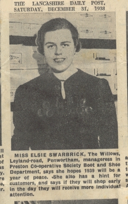she was "Brickie". in December 1938 the situation in Europe was looking grim and war seemed inevitable. Elsie must have had this on her mind when, on New Years Eve 1938, she was featured in the local paper, The Lancashire Daily Post, hoping for peace in 1939. (Ever the saleswoman, she couldn't resist the opportunity to offer advice to her customers to shop early to "receive more individual attention." But Elsie's hopes for peace faded as Hitler rattled his saber (and her German pen-pal, Jürgen Fritz, joined the 'Hitler Youth'). During the war, as young men were called to serve their King and County, Elsie left the shoe shop to work at Dick, Kerrs - doing her part for the war effort. It was a job that she loved so much she burst into tears when, at the end of the war, she was told that the assignment was ending. She returned to her job at the Shoe Shop and worked there until 1946. She had to leave her position at the Co-Op as married women were not allowed to work, and Elsie had become engaged (again). |
